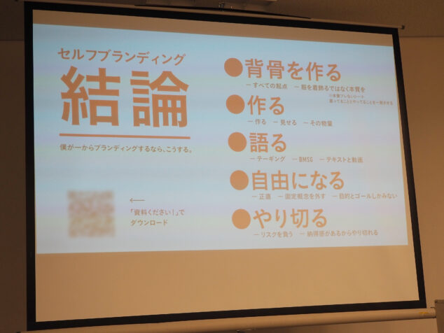 背骨がないと自分の言動がバラバラになり、周囲に信頼されにくくなる。何を大切にして動くかを自分の中で決めておくことが、セルフブランディングの最初の一歩だと語られました。