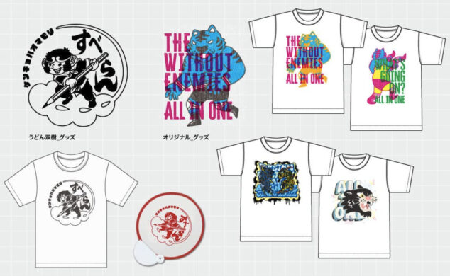 (↑前川さんデザインの飲食店グッズやオリジナルイラストTシャツ)