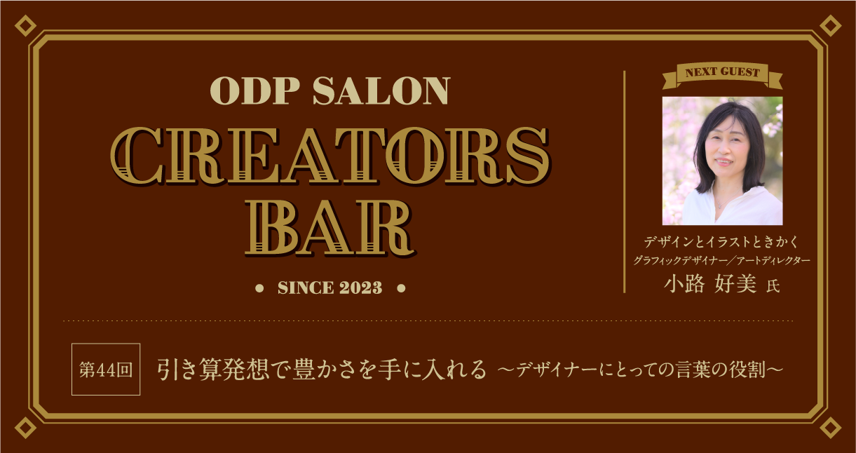 毎回ひとりのクリエイティブ関係者をゲストに迎え、ショートトークを通して仕事や好きなことなどをざっくばらんにお話ししてもらいます。その後、ODPの交流サロンのカウンターを挟み、まるでBARにいるかのような雰囲気でゆっくりまったり交流を深める企画です。